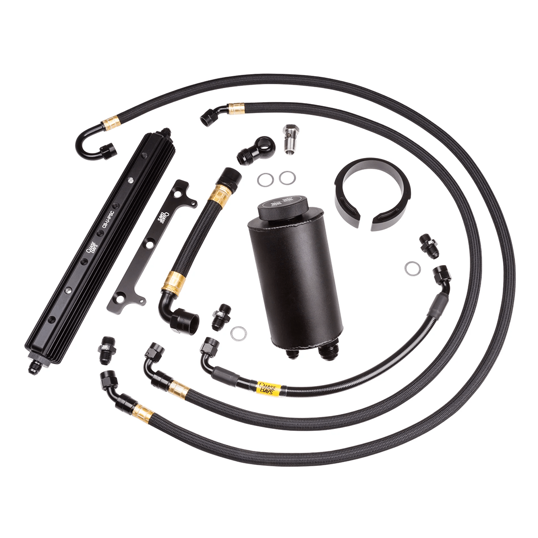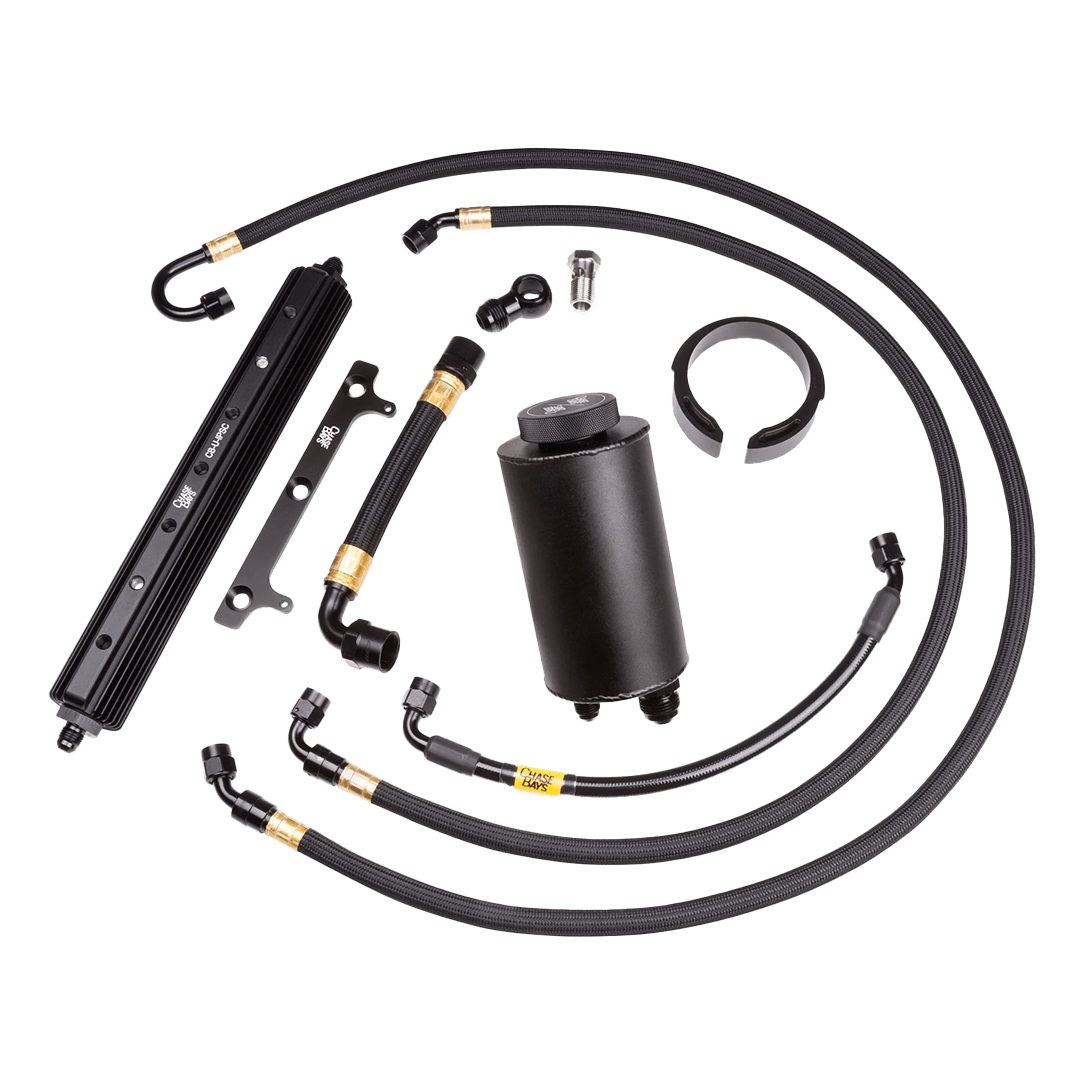 The Chase Bays E30 S50 Power Steering Kit is designed to eliminate the common factory power steering leaks, fluid spillover, and overheating issues with improved aesthetics, durability, and stealthy design. It is a full 100% upgraded A.N. Hose and Fitting replacement of the stock reservoir and hoses. From the reservoir to pump to rack (and cooler if upgraded). ALL Hose and Hose Ends are BMRS aka Brown and Miller Racing. This is the best Hose/Hose Ends in the world, the same components seen on NASCAR and Indy Car. All the Fitting Adapters are designed and manufactured by Chase Bays to…