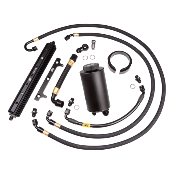 Chase Bays‘ over-engineered Triple-Baffled Power Steering Reservoir (aeration and spillover proof) is at the core of this kit. It optionally comes with an upgraded black aluminum heatsink cooler that mounts on the upper core support (see photos) for easy install and additional airflow. Chase Bays only uses the highest quality components available. Their reservoir is constructed of 6061 aluminum and is anodized black with a laser etched cap. The reservoir itself uses their Delrin Shim Bracket to conveniently use the OE BMW Reservoir Bracket (fun fact: This allows their Reservoir to be installed into virtually any BMW).